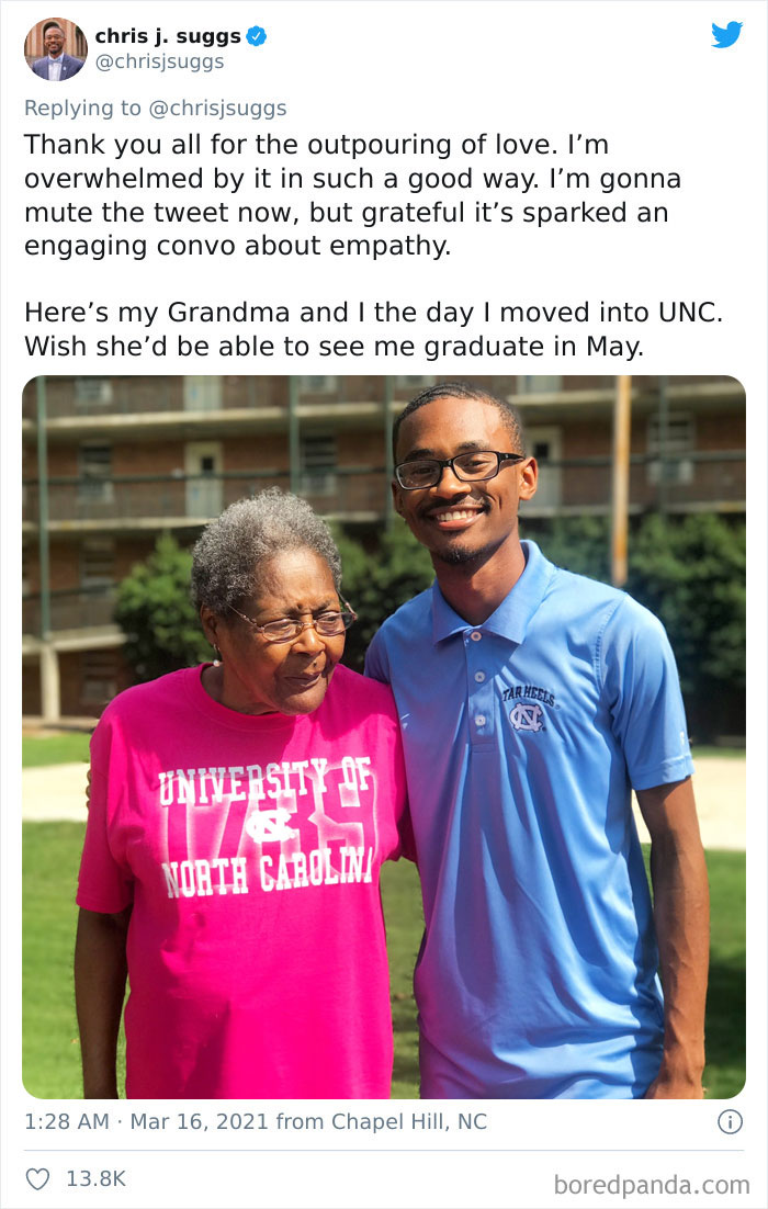 The thread was started by Chris, a senior class president UNC-Chapel Hill, who took it to social media to share how his professor asked for proof of his grandmother’s death in order to excuse his absence from class. “Empathy goes a long way and some folks just don’t have it,” Chris said in a post amassing 194.1K likes.