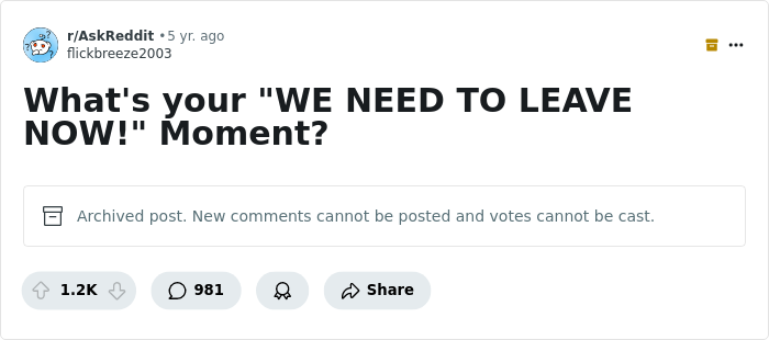 Load More Replies...If you take into account the post(s) they've got this from on reddit have the title 'What's your "We need to leave NOW" moment', the entries make a lot more sense.