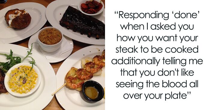 “Responding ‘done’ when I asked you how you want your steak to be cooked, additionally telling me that you don’t like seeing the blood all over your plate”