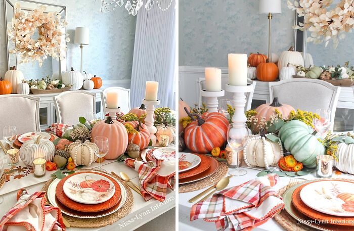 Thanksgiving home decor with pumpkins, candles, and elegant table setting in a cozy dining room.