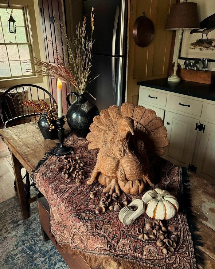 Thanksgiving home decor with a turkey sculpture, pumpkins, and acorns on a rustic table setting.