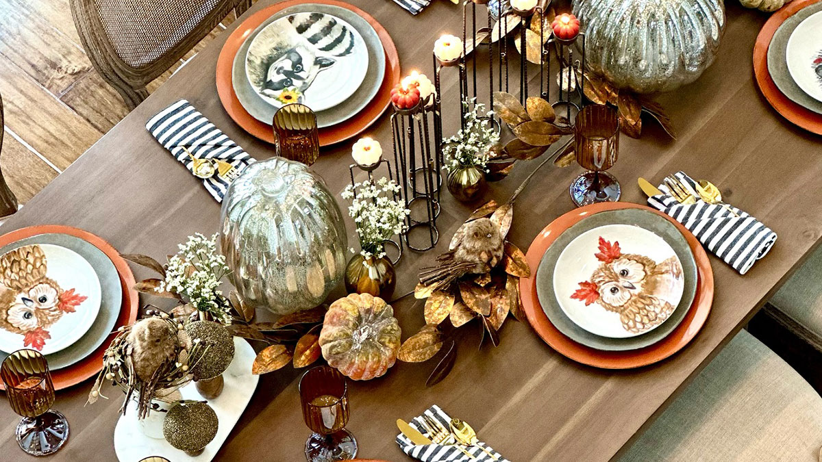 Thanksgiving table decor with owl-themed plates, pumpkins, striped napkins, and autumn accents for a cozy celebration.