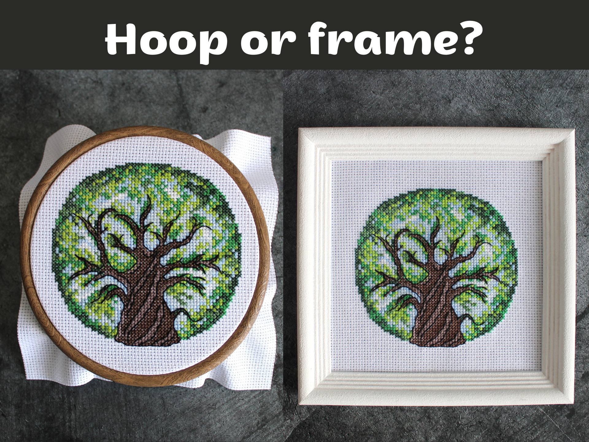 Hi there! I am a digital cross stitch pattern designer. Usually I know exactly how to decorate the finished project – in a frame or hoop. But with this tree I can’t decide which is better. How do you think?