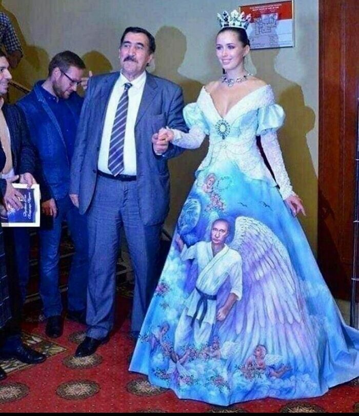That one is so weird, that it becomes good again. I just f*cking love that dress. I'm not planning on getting married, but if I ever do, I want to wear a dress with a Putin angel in judo clothes too.