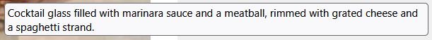 Cocktail glass filled with marinara sauce and a meatball, rimmed with grated cheese and a spaghetti strand.