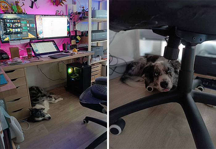 I mostly work from my apartment, so it's perfect for Sully, who is rarely alone. Usually, Sully wakes me up (since I have a sleep disorder, mornings are hard for me), I have a coffee, and then I go for a morning walk. After that, I'm back home, eat, and start working. Sully lies at my feet. We go for a second short walk after lunch, and then I'm back at work before the evening walk, where Sully sees his neighborhood dog friends.
