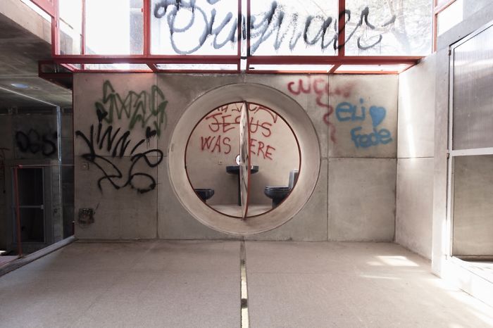 The tree house or experimental house designed by Giuseppe Perugini, Perugini and Raynaldo Uga De Plaisant is built in Fregene in the late 60s. This is an experimental project in both form and use of materials, which refer brutalist architecture characterized by the use of rough concrete façade. The building seems suspended between the tall trees that surround it, at the same time evoking the archetype of the “nest” as a safe place to hide, study, get your strength back. The building, in decided contrast to the traditional surrounding homes, impresses with its unique appearance, with the texture of the beams and columns to view supporting volumes prefabricated, the system does not adjust, as well as the concrete fence of the lot with embedded steel strips dyed red which follow the curved shape of the enclosure itself. Few materials are used for the construction: concrete, glass and steel. Perugini then rejects the traditional materials of construction and chooses the reinforced concrete, which is fulfilling the function to support / sustain the volumes that contain the various rooms of the house, arranged in an apparently random order