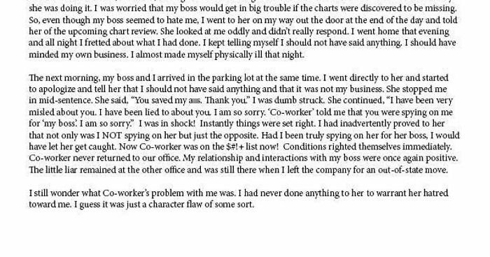 The next morning, my boss and I arrived in the parking lot at the same time. I went directly to her and started to apologize and tell her that I should not have said anything and that it was not my business. She stopped me in mid-sentence. She said, “You saved my ass. Thank you.” I was dumb struck. She continued, “I have been very misled about you. I have been lied to about you. I am so sorry. ‘Co-worker’ told me that you were spying on me for ‘my boss’. I am so sorry.” I was in shock! Instantly things were set right. I had inadvertently proved to her that not only was I NOT spying on her but just the opposite. Had I been truly spying on her for her boss, I would have let her get caught. Now Co-worker was on the $#!+ list now! Conditions righted themselves immediately. Co-worker never returned to our office. My relationship and interactions with my boss were once again positive. The little liar remained at the other office and was still there when I left the company for an out-of-state move.