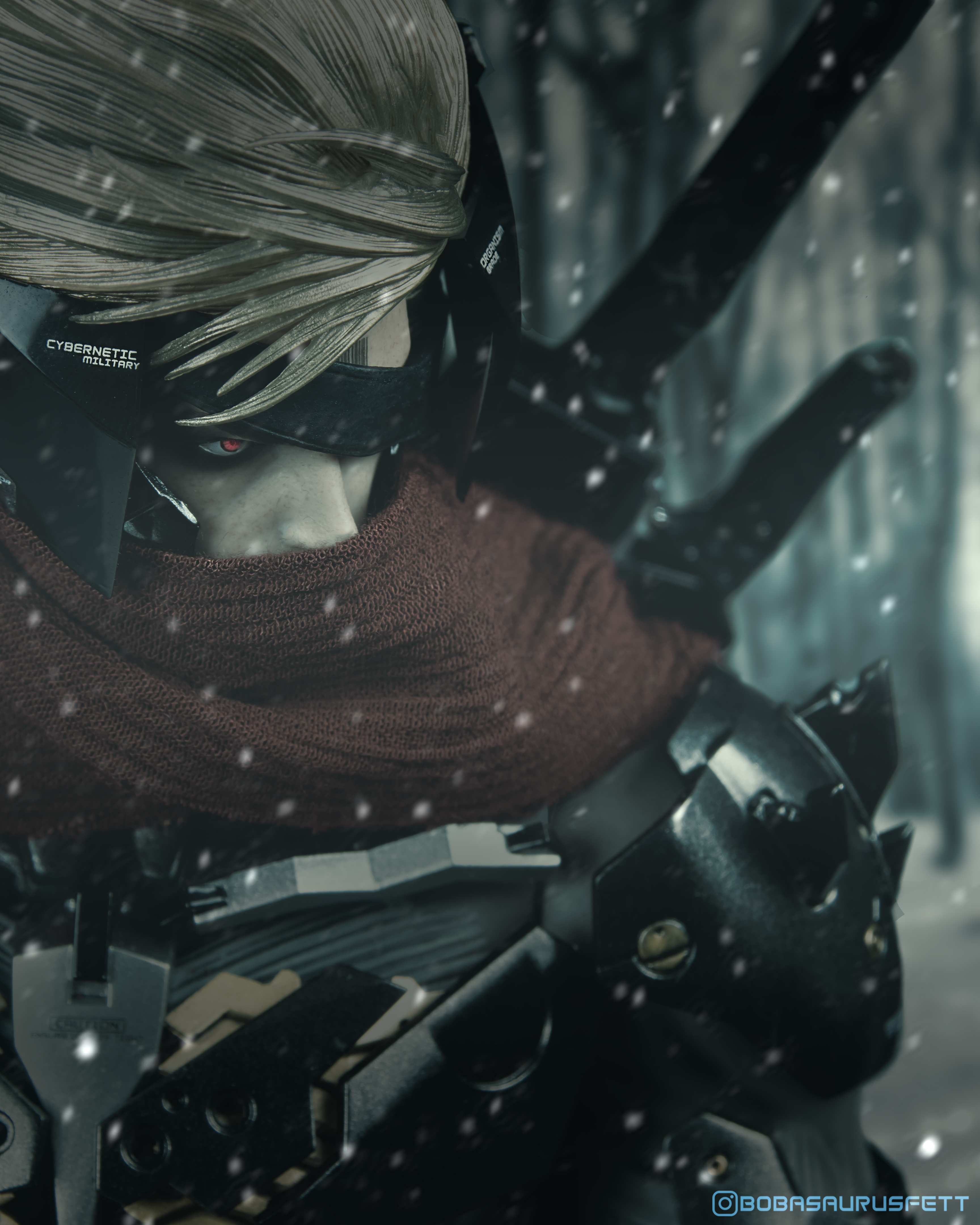 Toy Photography: This is a 1/6 Scale Raiden Figure from Metal Gear Rising: Revengeance. Product by Hot Toys Collectibles/Sideshow Collectibles. Raiden is dope Cyborg Ninja. I put a scarf on him cause awesome characters in anime, ninja flicks, other forms of the medium wear some form of face-cover. I put him in a snowy forest setting because that’s where you’d find “The Lone Wolf.”