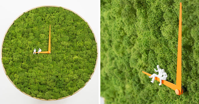 The idea to design this clock came after my old wall clock unexpectedly perished after a great party. Later after a thorough research I realized that nothing on the market will fill the emptiness on my wall. That’s when I made a first prototype for the Moss Clock. The thought to bring something colorful into white – typical architect’s interior space was quite natural and Norwegian reindeer moss did the perfect job! There is something transcendental and timeless about the moss.