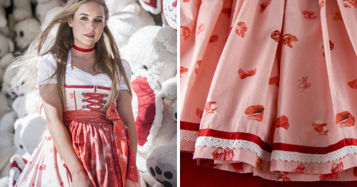 I wanted to make a really special dress for this years Oktoberfest and for this designed a meat pattern from images cut out of supermarket advertising.
