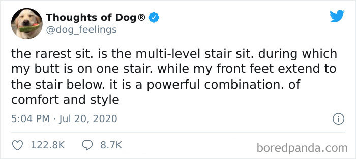 It turns out, hooman sit is not the only sit popular in the doggo world. Apparently, there’s one resting posture which is a powerful combination of both comfort and style. Brought to the center of attention by the Twitter account Thoughts Of Dog, “the rarest sit” is the holy grail of dog positions. Here's how it's executed, no chairs needed: “my butt is on one stair, while my front feet extend to the stair below.” Location is free to improvise, but stairs, couches, and beds are among the faves.