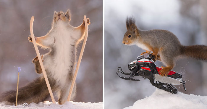 Every day these wild red squirrels are being challenged to find there food. For 5 years, I have placed props in scenes with food in my garden. Every day I wait for them to capture them for my camera. I started with this series with the first snow in October. Sometimes I never get the shot I am looking for. It is most of the time a challenge maybe that is why I still shoot squirrel photos. They never bore me, besides that, they have become my close little friends.