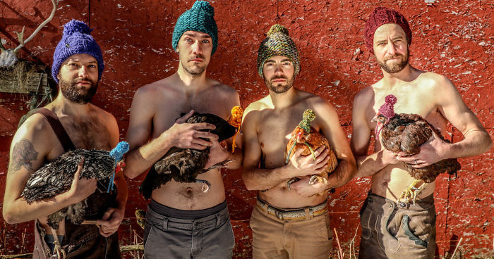 Onlookers cracked up as they watched the men hold chickens with matching pom hats. The resulting pictures are absolutely adorable! The men didn’t have any previous modeling experience but they knew they could just wing it.