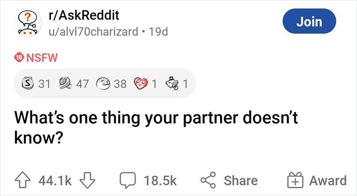 "Now I like to think that my wife and I are super open about our relationship, but surely there’s something we don’t know right? So, I asked her and much to my surprise she said, 'Everything and anything I know you know.' I felt relieved almost instantly, but I figured someone out there needed to answer the question for their own well-being. So, I created the question in the thread!"