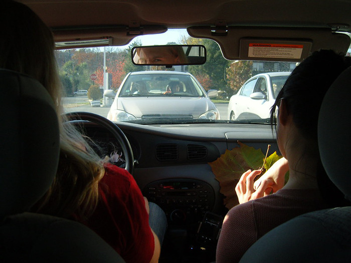 People riding in cars without seatbelts plus four or five kids seated in the back.