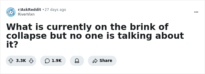 But there also are some niche things that most us don't know. Threats to certain ecosystems, old infrastructure, and complex processes in our oceans are just some of the things people have shared in an online thread under the question "What is currently on the brink of collapse but no one is talking about it?"