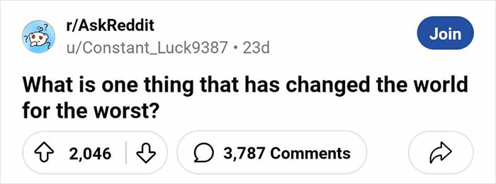 User u/Constant_Luck9387 sparked an interesting online discussion after asking the members of the r/AskReddit community to share what they think are the top things that have changed the world for the worse. Scroll down to see what they had to say. Their answers were illuminating, and they shed some light on what people consider to be the top problems of the day.