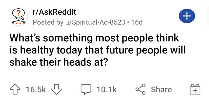 One curious Reddit user recently asked, “What’s something most people think is healthy today that future people will shake their heads at?”, and thousands of people called out common dietary advice, lifestyle practices and habits in the replies. Below, we’ve gathered some of their most thought-provoking responses, so be sure to upvote the things you are wary of as well. Then let us know in the comments what else you think will be viewed as unhealthy in the future, and if you’re interested in checking out another Bored Panda article debunking food and nutrition myths, you can find that right here.