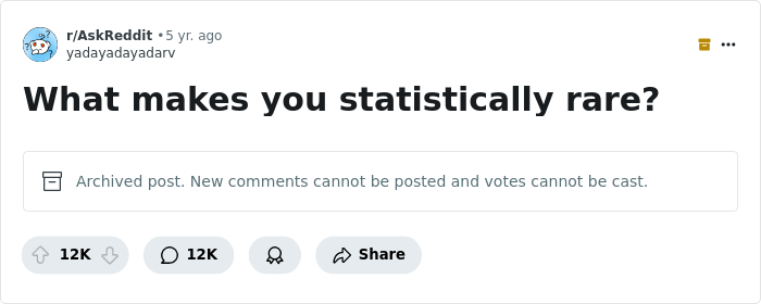 What makes you a statistical rarity or total anomaly, dear Pandas? Do you have any bizarre allergies? Were you born with any genetic quirks? Have you ever been in a million-to-one situation?
