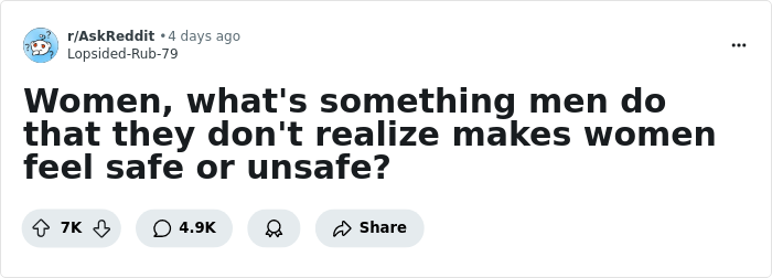 Because of this, many women stay cautious around the men they cross paths with. On Reddit, they shared the kinds of behaviors men often don’t realize can either make them feel safe in those moments or creep them out completely.