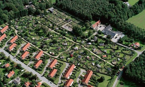 The Naerum suburban district of Copenhagen, in Denmark: In 1948, 40 oval allotment gardens, each measuring approximately 25 × 15 m, were laid out on a rolling lawn, between public housing on one side and more traditional allotments on the other. Owners were free to position their cottages, select the surrounding hedges, and lay out the interior of their plots, Seventy later, and the oval gardens of Naerum are still one of the most beautiful attractions in the Danish capital.