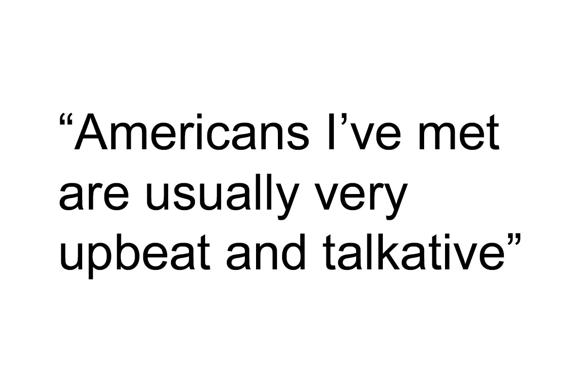 30 Non-Americans Explain What They Like Best About The United States Americans I’ve met are usually a delight to talk to. Very upbeat and talkative from my experience. I still remember a conversation I had with a small family who were on holiday on holiday where I live. They basically told me their life story and what they were up to that day. Didn’t know them but it made my commute home more interesting.