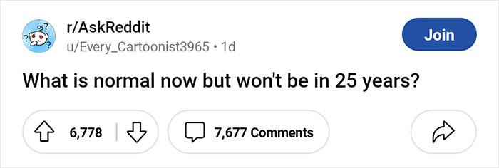 Expanding on the notion, Reddit user Every_Cartoonist3965 made a post on the platform, asking everyone, "What is normal now but won't be in 25 years?" and people immediately started sending in their answers.