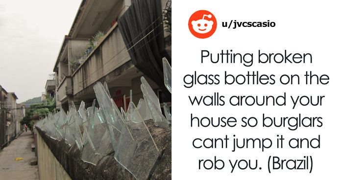 Putting broken glass bottles on the walls around your house so burglars cant jump it and rob you. I moved to Canada and they don't even have walls around the houses! (Brazil)