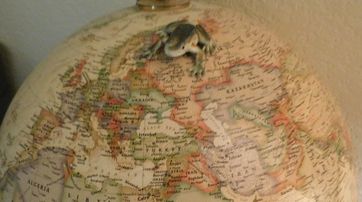 Cube-shaped globe with vintage map design inside a black metal stand, a confusing image that gets weirder the longer you look.