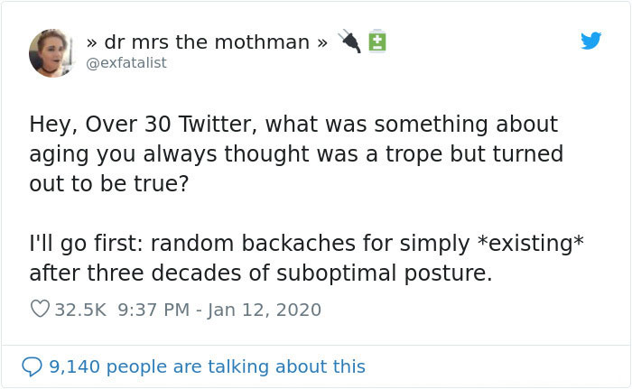 As much as advertising would have you believe that when you turn 30, you quit interacting with anybody other than your government-issued spouse and your hobbies narrow to leisurely jogging or preparing months in advance to do taxes, most people find that not much actually changes when they enter the new decade. Or so they think. In this thread on Twitter, people are revealing that while not all the ominous warnings they heard about aging are true, there are some of them that are, and they start early.