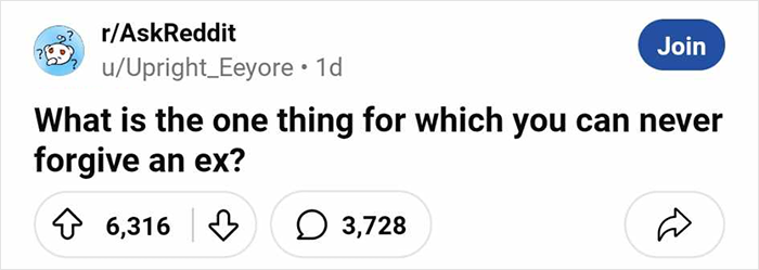 However, there are situations where no matter how much time passes, you still feel resentment toward them. Prompted by user u/Upright_Eeyore, some members of the popular r/AskReddit online group opened up about why they’ll never forgive their exes. We’ve collected the most candid and dramatic stories to share with you. Scroll down to check them out.