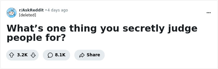 For some, it’s their choice of clothing or the cars they drive. For others—it’s the way people handle themselves in public or the things they do behind closed doors. You get the idea—the reasons are ample. Members of the ‘Ask Reddit’ community recently discussed such reasons, after one netizen asked them about that one thing they secretly judge people for. If you’re curious to see what it is that Redditors can’t tolerate, scroll down to find their answers on the list below and feel free to upvote the reasons—if any—that might make you, too, a little judgmental.