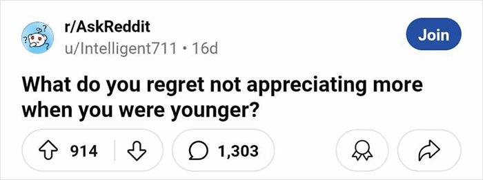 Recently, someone on Reddit asked a rather existential question: “What do you regret not appreciating more when you were younger?” Responses poured in as people talked about how they should’ve spent more time with close friends or taken their parents’ advice.