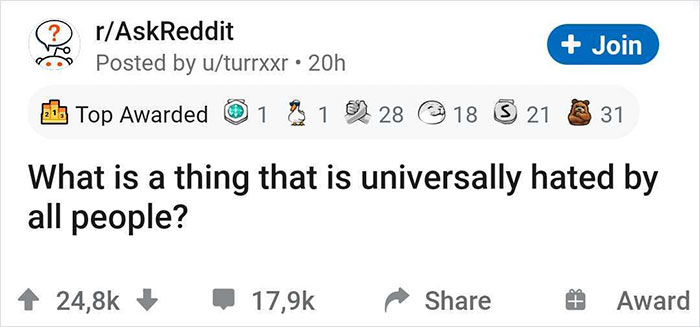 Just a few days ago, Redditor u/turrxxr decided to find out what helps us to relate to one another and asked the following question: "What is a thing that is universally hated by all people?" And everyone immediately started sending in their answers. From traffic to wet socks, here are those that have got the most upvotes!