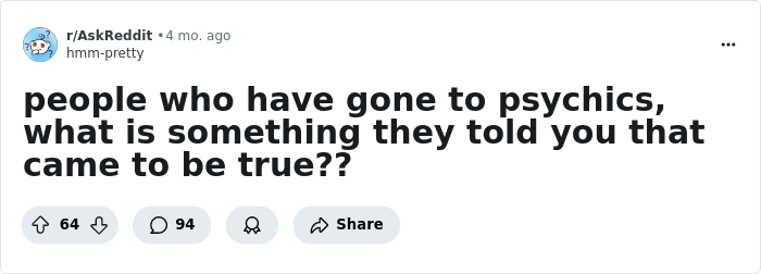 Redditors have been sharing examples of predictions they were told by psychics that ended up coming true, so we’ve gathered their most fascinating stories below. Whether these were coincidences or not, we’ll never know. But we hope you enjoy this list, and be sure to upvote the replies that make you want to book an appointment with your local soothsayer!