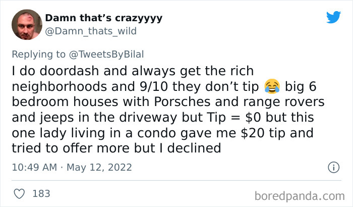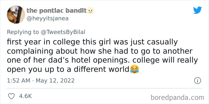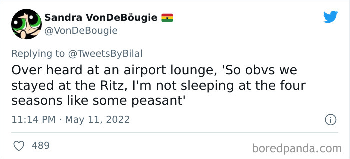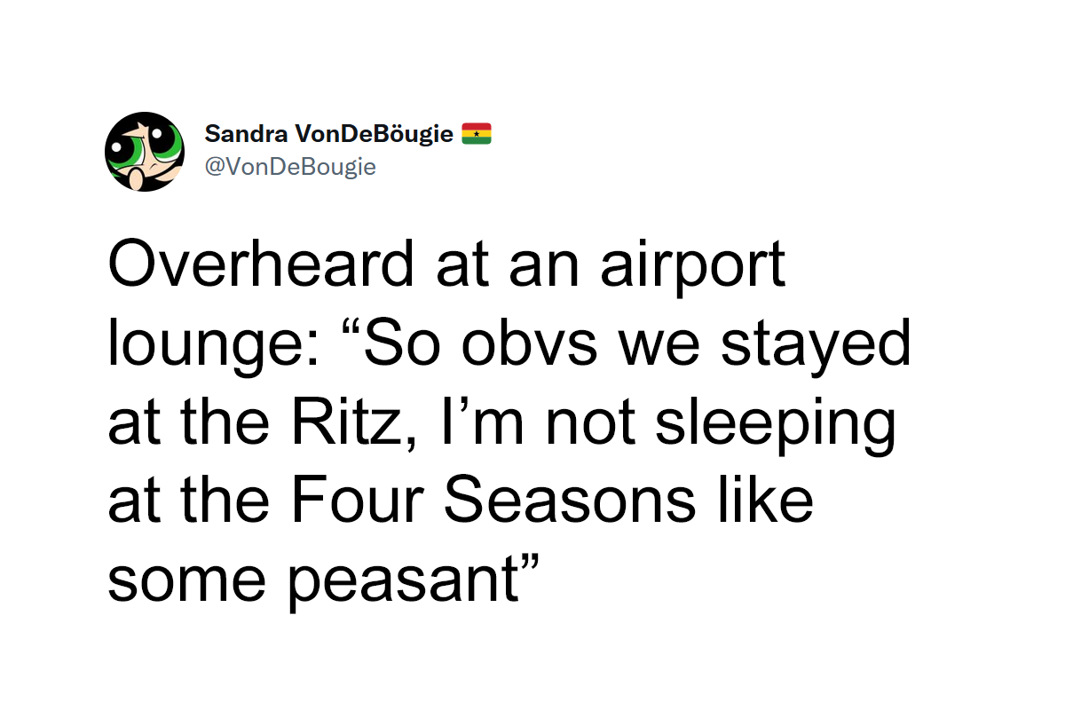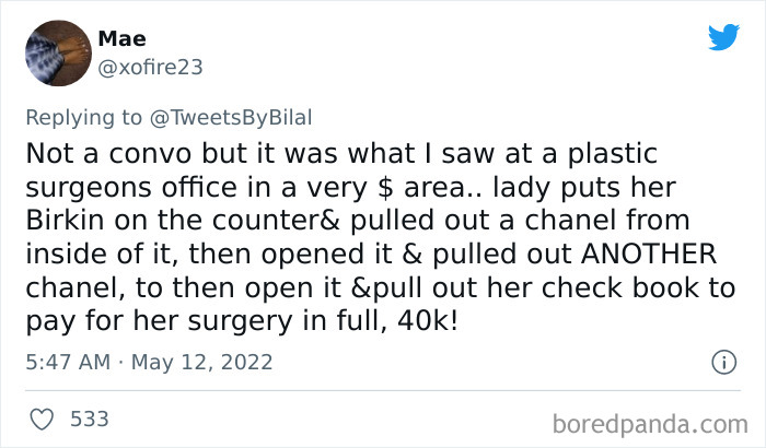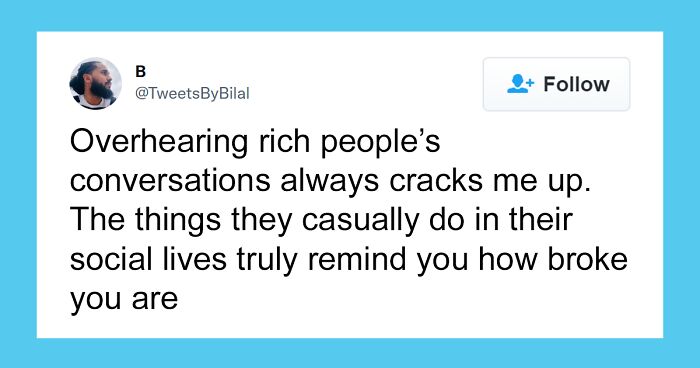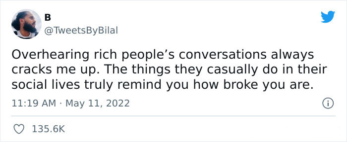 "Overhearing rich people's conversations always cracks me up," Bilal said. "The things they casually do in their social lives truly remind you how broke you are." In just a few days, his words received 136,000 likes and, more interestingly, inspired folks to share examples of these exact situations.