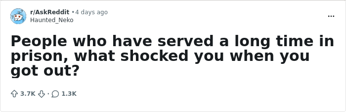 Man with hands on head looking stressed, reflecting on things that shocked people after they got out of prison I work in the prison system in NC and work with inmates all day every day, and I've heard some crazy stories from a lot of these guys and most of them don't know how to function on the outside after being locked up for so long, they literally become institutionalized. I know one guy who's getting out in about 5 months and he's been locked up since 1985. The guy has never been in a Walmart that's how long he's been locked up. He's genuinely scared of getting out but he's got some support on the outside and already a job lined up so hopefully he makes it. But it makes sense because you've been told when to eat when to wake up for 20+ years and then one day you have freedom and almost don't know how to act.