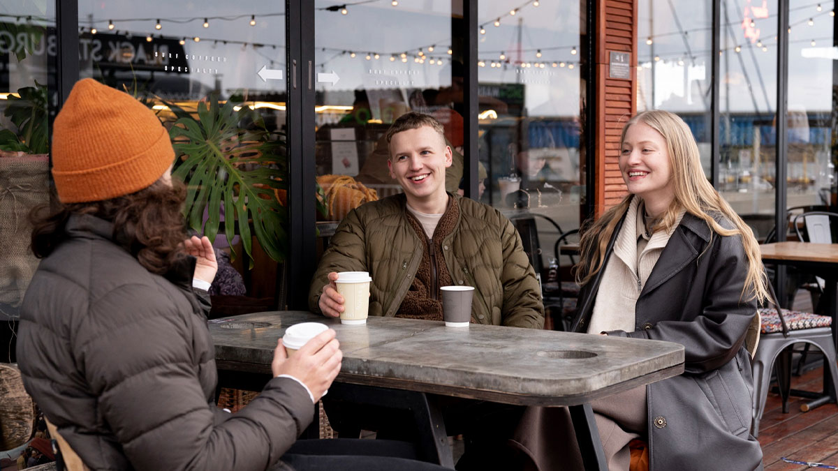 Three friends enjoying coffee and conversation outdoors, reflecting trust and patience from the good old days disappearing. Third spaces.. for many it’s just home and work now.