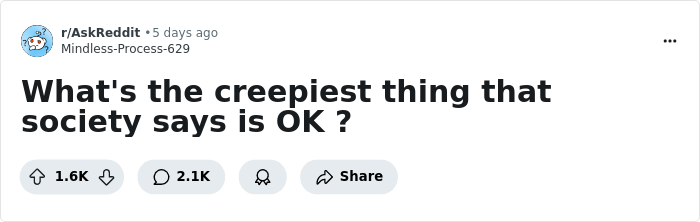 “I was just thinking about how many things in society are normalized but can actually be pretty unsettling when you really think about them—like invasive advertising, unsolicited opinions on personal lives, or even certain workplace expectations,” they told us. “It made me curious about what others find creepy but socially accepted, so I decided to ask Reddit!”