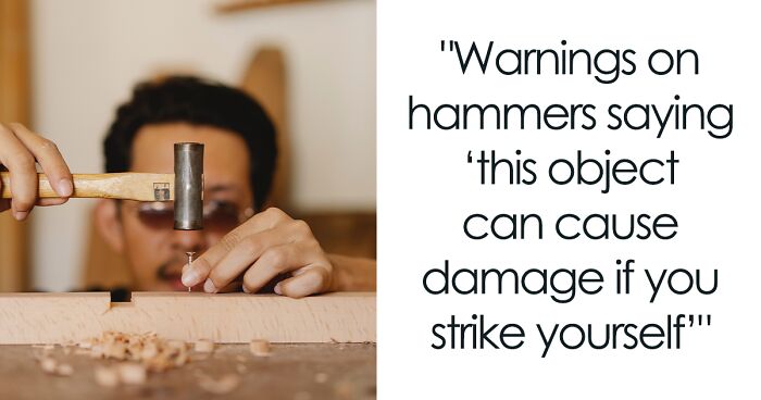 "Warnings on hammers saying this object can cause damage if you strike yourself."