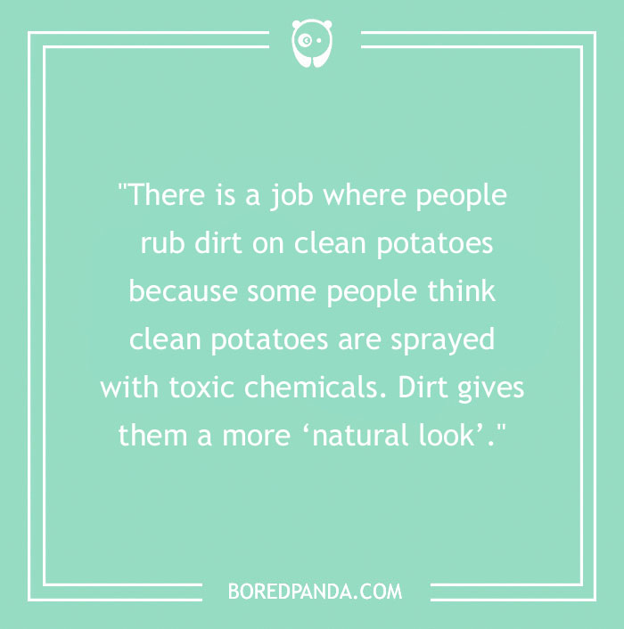 "There is a job where people rub dirt on clean potatoes because some people think clean potatoes are sprayed with toxic chemicals. Dirt gives them a more ‘natural look’."