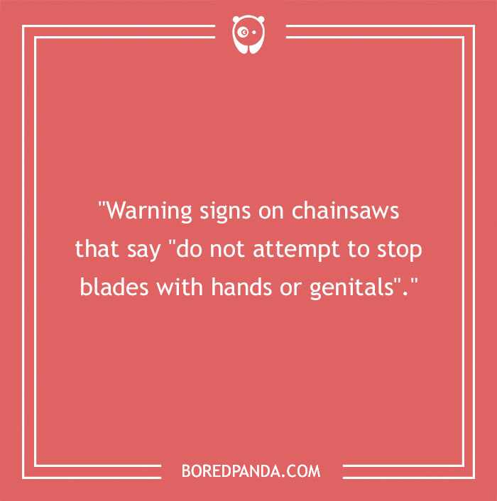 "Warning signs on chainsaws that say "do not attempt to stop blades with hands or genitals"."