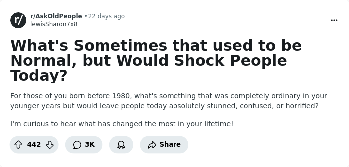 This was a discussion in a recent Reddit thread. Older folks looked back on a time when it was acceptable to smoke cigarettes on airplanes, walk through airline gates without a ticket, and have a phonebook containing personal information for everyone to see.