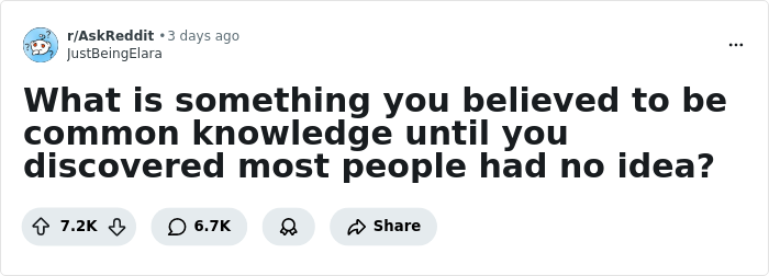 Reddit user JustBeingElara recently asked the platform what common knowledge they realized wasn't so common.