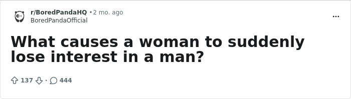 So we gathered the most interesting responses to a thread posted on BoredPandaHQ, asking netizens to weigh in on what causes women to rapidly lose interest in a man. Get comfortable as you scroll through, upvote your favorites and be sure to head on over to the BP community and follow the page for more interesting threads and memes.