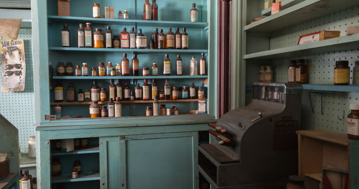 Vintage cash register and medicines sit as if they were being used yesterday