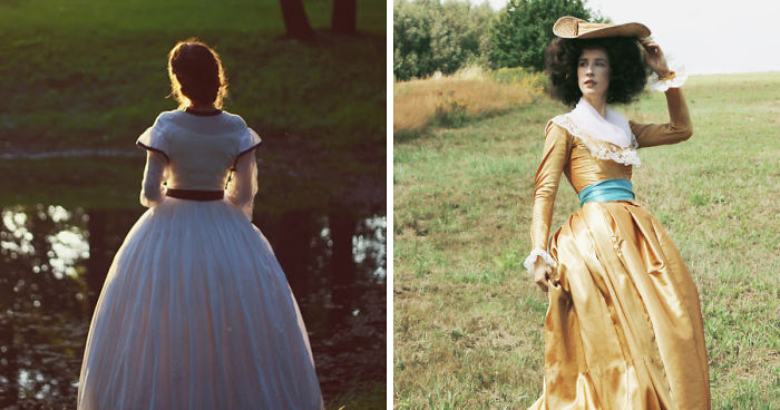 Karolina makes her own costumes, often using inexpensive materials, such as bedsheets, fleece blankets and cardboard, to recreate authentic silhouettes and styles. Not only does she sew pretty dresses, but also pays attention to what happened underneath – all the petticoats, crinolines, bustles, pads and corsets.