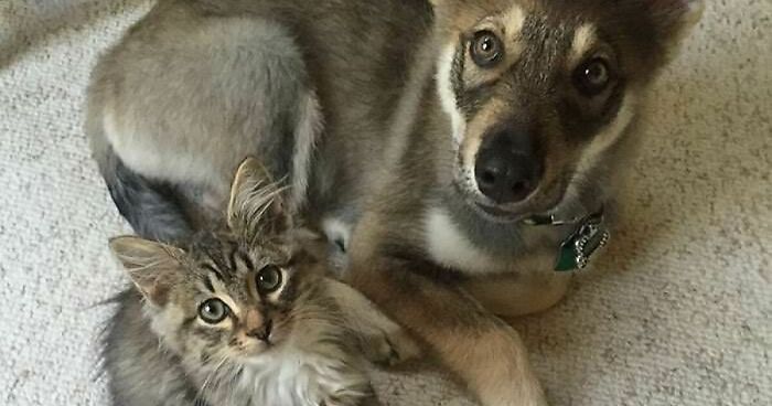 “They are perfect with each other. They don’t cuddle as much as they used to when they were a puppy and kitten. But they’re still always together, always playing together”