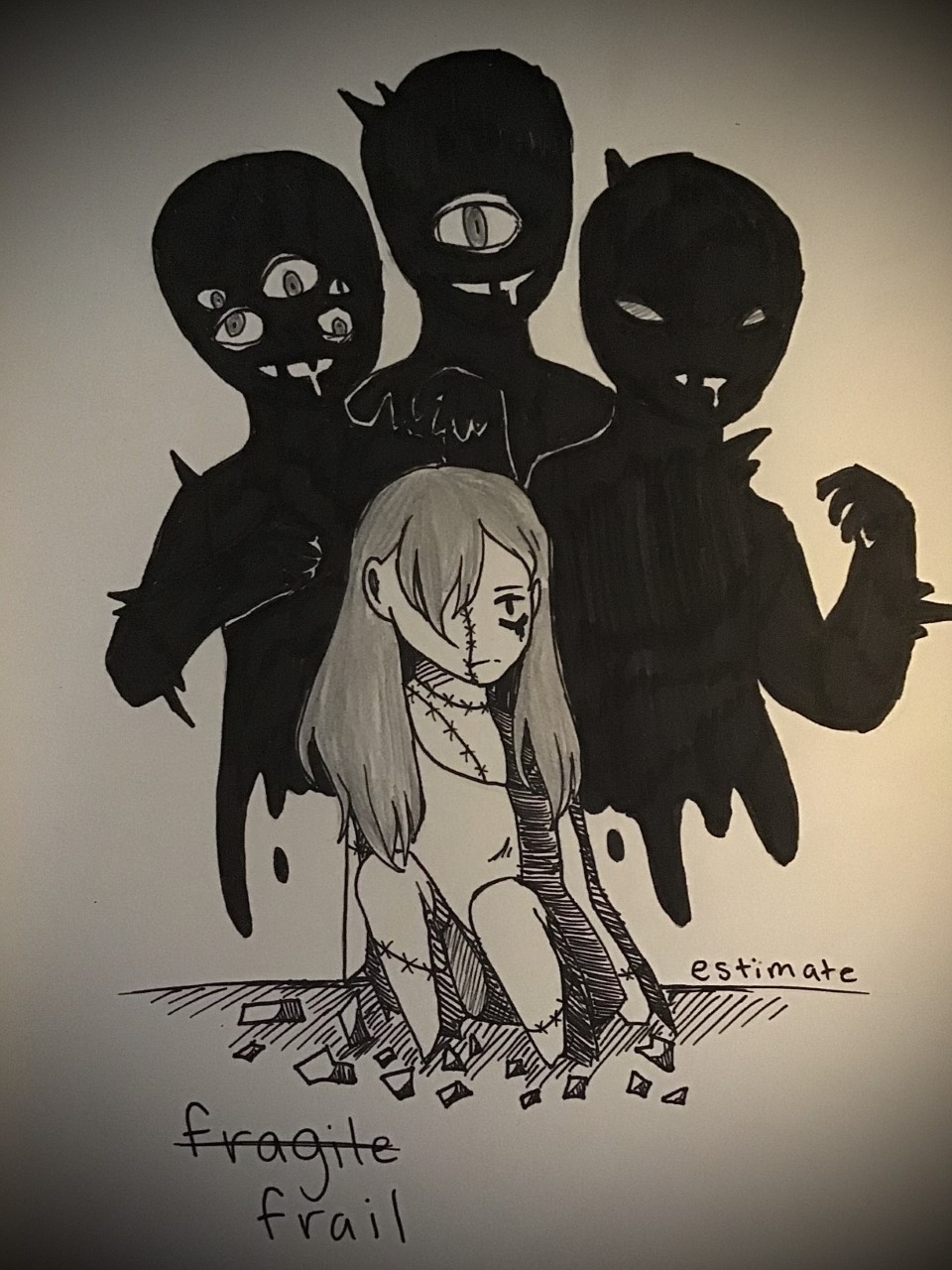 Thank you and don't worry; I can share my spotlight. Your drawing is pretty amazing, I especially love the pieces by the girl's legs, the eyes on the creatures behind her and the stitches all over her body.
